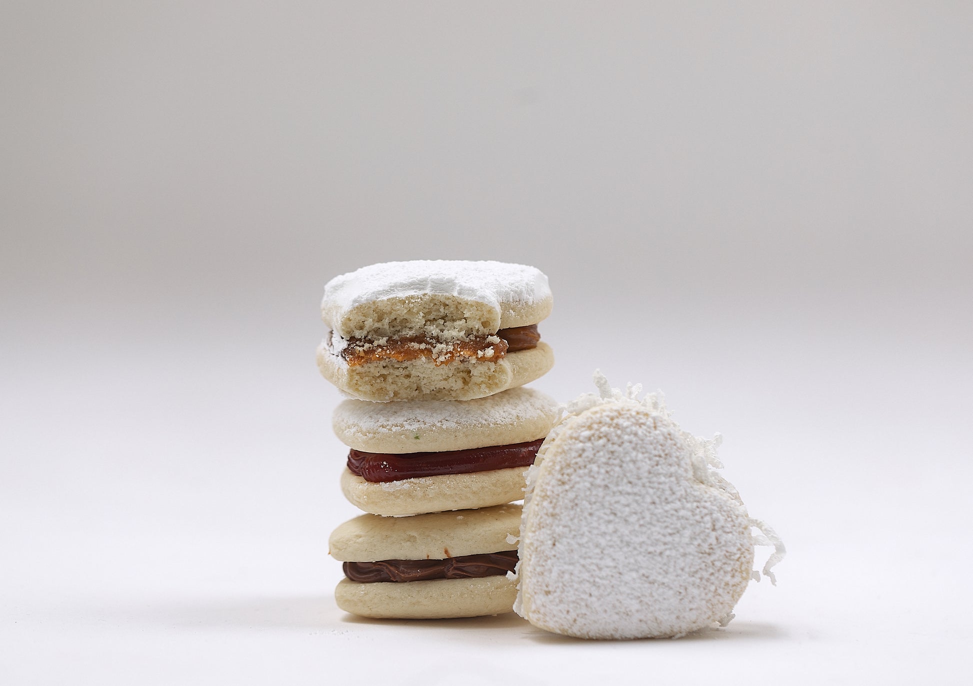 Enjoy the delicate and smooth texture of our handmade Luma alfajores. Each treat features two soft cookies with a rich dulce de leche filling in the middle.